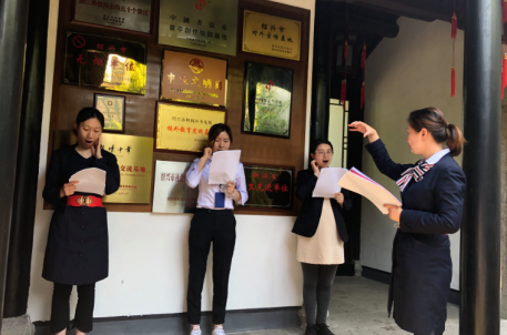 随着疫情得到有效控制,绍兴景区面向全国人民免费开放,带起了疫情后的第一波小高潮。景区在确保防疫工作安全有效开展的同时,积极推动复工复产。与此同时,景区工作人员也不忘时时充电,讲解员作为窗口的一道风景线,在很大程度上代表着景区形象,是藏品和观众之间情感与信息交流沟通的最重要桥梁和纽带。因此对讲解员的定期培训显得尤为重要。本月讲解培训在首席讲解员胡安娜的指导下进行发声练习。