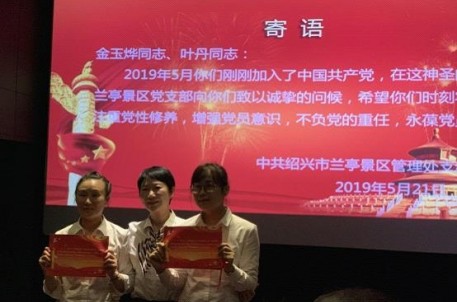 为使活动意义高远也贴合群众,观影前,支部开展了以“祝福寄语,携手前行”为主题的活动。兰亭景区党支部书记为两位新晋预备党员送上了来自景区党支部的礼物,并向两位预备党员表示衷心的祝贺和诚挚的问候,希望她们:时刻不忘初心,牢记使命,注重党性修养,增强党员意识,不负党的重任,永葆党员本色。