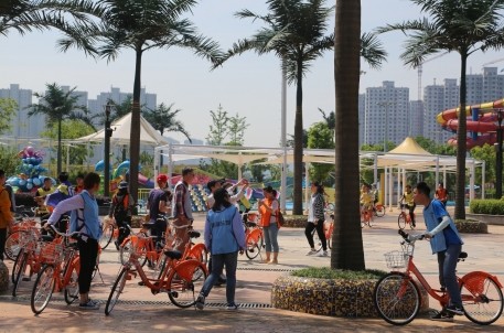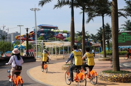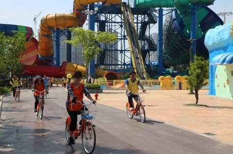 集团等社会各界青年前来参加。参加活动的嘉宾和市民,穿着镜湖乐园的骑行背心,骑着公共自行车,开始了绕行乐园一圈的骑行之旅。在骑行的过程中,他们不时地拿出手机拍下了乐园美丽的风景,还热情地和乐园吉祥物进行互动,欢声笑语充满了整个园区。