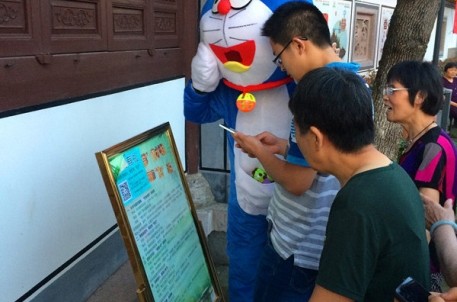 夜游环城河,我们通过水城旅游微信公众平台推出了乘船游绍兴,等您来“砍价”活动。活动一经推出就得到广大微友的积极响应,同时为配合本次活动,我们还在又一村游船码头精心安排了“多啦A梦”为游客们送上精美香囊等好礼。他一出现在码头,游人们就围着他拍照,扫二维码,顿时码头人气大增。据统计,本次砍价活动共有近1000人参与。依据砍价排行榜,前200名的幸运微友可以在9月30日前领取船票,免费畅游环城河。