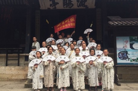 7月3日上午,杭州时代小学的30多位学生特地前来参加兰亭书法夏令营,体验了扇面描红与曲水流觞活动,充分领略和感受了兰亭的美丽景致和浓厚的文化魅力。王右军祠里,小朋友们在工作人员指导下,在扇面上认真描摹“兰亭”二字,描完后切磋比较、开心展示各自的作品;曲水流觞处,小朋友们换上晋服列坐曲水两旁,流觞吟诗,表演才艺,气氛热烈。最后,小朋友们着身晋服、手持扇面在流觞亭前合影留念。
