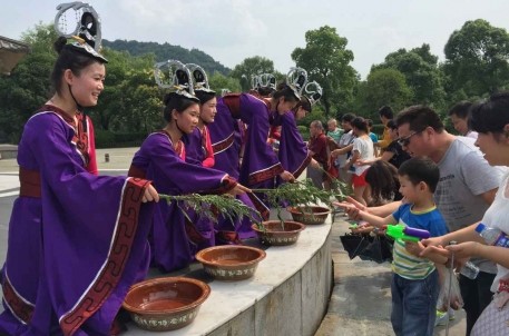 6月20日,端午节首天,绍兴会稽山景区祭禹广场热闹非凡,一场名为“礼舞怀古人,敬香祈福康”的端午特色活动正在精彩演出中:随着《屈原问渡》音乐的响起,只见祭禹广场八卦台上的八位仕女,双手合礼,绕台成圆而行,行一步,恭一次礼;站在台中央的三位礼生,则各持三只清香,靠背而立,朝天祈福。舞毕,礼生向众游客发放贡品,祈福仕女则散福水,取意平安、如意、健康!