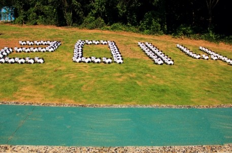 为了让千只“大熊猫”憨味更浓,会稽山景区在布置这些熊猫时,尽可能让“熊猫宝宝”萌态百出。趴着、躺着、端坐着的熊猫宝宝,形态各异,有的在树下乘凉,有的在挠头,有的抱着足球玩耍……景区还布置了“风车”熊猫队形、“love”队形等。