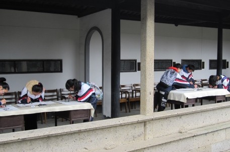 下午一点,驱车前往兰亭景区,景区讲解员生动立体的向同学们讲述了王羲之和兰亭的故事,使他们了解王羲之热爱书法、钻研书法的学习历程,从而激发大家热爱学习、坚持不懈的学习热情。景区为每位同学提供一张书法描红纸,让大家亲身感受书法魅力,通过书法知识讲堂使同学们掌握书法的基础知识,激发大家对书法的兴趣。在曲水流觞体验区,同学们穿上古装,临流觞咏,虽然用可乐代替了酒,但也真正体验了一次古人饮酒赋诗的修禊雅事。