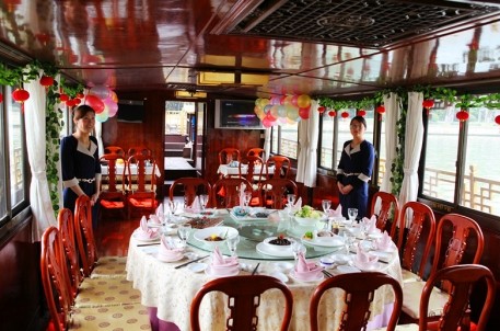11日上午,环城河的游船上充满了阵阵欢声笑语,原来大家正在为宣传“水上船餐”而紧张忙碌着。只见船舱里面挂满了灯笼、气球和各种装饰品,经过大家群策群力,顿时游船被打造成了一个颇具气派的“水上餐厅”。船舱里的环境每一个细节都做得很到位,就连菜式菜品也都装饰得十分精致。只见餐桌上,有香味四溢的梅干菜扣肉、色泽鲜艳的秘制牛排、香港鲍鱼鱼翅、精致的杭帮菜、绍兴本土特色菜、粤菜、川菜等等,还有几种口味独特的小点心,看了不禁让人垂涎欲滴。