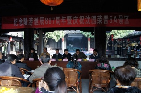 12月5日,纪念陆游诞辰887周年暨庆祝沈园景区荣晋5A景区座谈会在沈园双桂堂举行,会长高利华、常务副会长来家炯、王致涌、副会长黄锡云、顾问钱茂竹、名誉会长章生建等陆游研究会理事会成员及广大会员出席了座谈会,县文联主席、副会长黄锡云主持了座谈会。会议宣布了第五届理事会成员名单。会上,沈园景区管理处主任、常务副会长来家炯发表了沈园荣晋5A景区感言,回顾了沈园景区在5A创建与陆游文化研究、传承、发扬等方面所取得的成绩。随后,会长高利华教授总结了陆游研究会第四届理事会的主要工作,提出了下阶段的工作计划,包括一次会议:明年在四川举行的纪念陆游诞辰888周年暨陆游与西蜀文化国际研讨会;一个网站:陆游研究会网站;一个讲堂:配合做好《社科大讲堂》的讲座和宣传;一次参谋:陆游纪念馆、陆游故里的参谋推动,为传承弘扬陆游文化做出新的贡献。