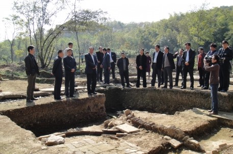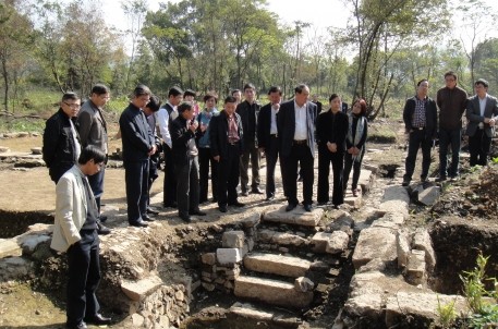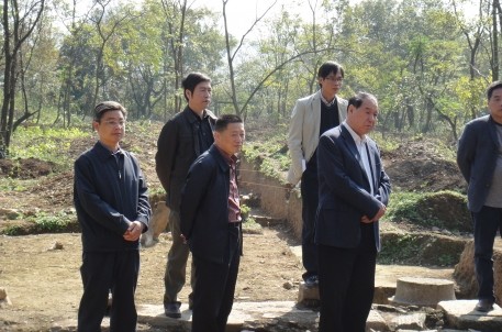 11月13日上午,全国政协文史和学习委员会副主任周国富一行在市委副书记、市长钱建民,市委副书记王文序,副市长冯建荣,市旅游协会会长顾秋麟,市旅游集团董事长沈安龙等人的陪同下,来到兰亭景区考察天章寺遗址考古挖掘情况。在考古现场,浙江省考古所所长李小宁向领导们详细介绍了考古挖掘的整体情况,并分析了目前发现的天章寺遗址的整体布局和不同朝代分段情况等相关内容。