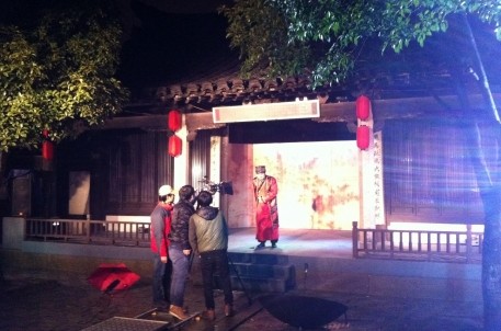 3月3日晚上,微电影摄制组在沈园景区双桂堂内紧锣密鼓的搭建设备、布置场景,为晚上的拍摄做准备。当天晚上拍摄的内容是女主角观看沈园之夜,聆听陆游和唐琬凄美的爱情故事,品读千古绝唱《钗头凤》。雨帘下,台上深情演出,台下主角若有所思,看似一副从容清幽的画面对于现场的工作人员而言可就不那么惬意了。大雨增加了现场拍摄的难度,加上是夜间拍摄,对于灯光的要求也非常高。为了保证影片质量,同一个镜头可能需要反复拍摄。由于恰逢周六,当晚沈园之夜游客较多,为了确保整个现场井然有序,景区工作人员全程陪同维持秩序,协助拍摄顺利完成。在沈园之夜堂会演艺结束后,为了追求更好的影片效果,摄制小组又重拍了一些镜头,拍摄结束已是凌晨。