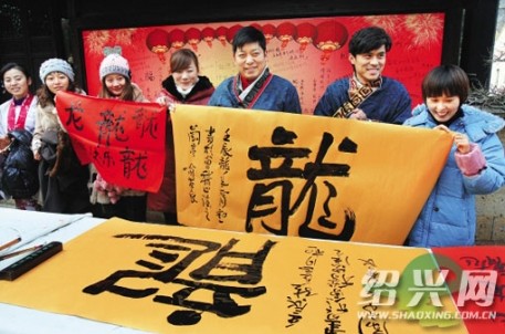 正月初一,兰亭主区副主任、绍兴知名书家喻革良携员工和游客一起在流觞亭前泼墨挥毫,书写“龙”字,喜迎龙年第一天。大幅照片登上了《绍兴晚报》。 兰亭景区:史春霞(文) 晚报照片由记者石皎月拍摄