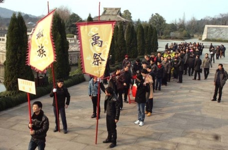 新春佳节,时值正月初一,每年一度的姒氏“族祭”在大禹陵内举行,10时许,祭禹广场齐集以姒氏宗族及河南夏氏、绍兴鲍氏、余氏、楼氏代表共三百余人,抬锣鸣道,怀着对先祖的崇敬与缅怀,列队缓缓步入大禹陵。在享殿由大禹第一百四十二代孙、绍兴姒族研究会会长姒大牛主持举行了2012年姒氏祭祖典礼,仪程由献“三牲”、敬香、告祭组成。随后,姒族文化研究会、各支系和各姓氏文化研究会都向大禹敬献了花篮。仪式体现了浓郁的氏族文化和悠远的祭禹历史。