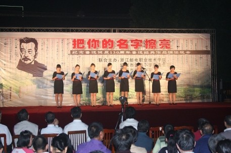 9月25日晚的鲁迅故里广场,虽然细雨绵绵,却挡不住人们聆听鲁迅声音的脚步。在一首臧克家的《有的人》中,一台主题为“把你的名字擦亮”的鲁迅经典作品诵读晚会拉开序幕,成为纪念鲁迅诞辰130周年的压轴好戏。整台晚会由故乡情怀、民族脊梁和精神丰碑三个篇章组成,故乡人民用饱含深情的语调表达了对鲁迅先生的敬意和怀念。