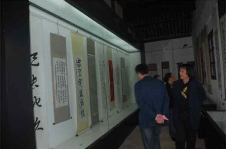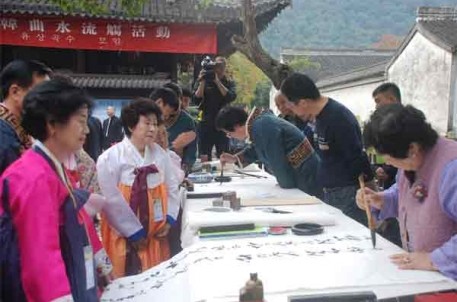 10月27日下午,由中国兰亭书会、韩国世宗韩文书法协会共同主办,兰亭景区承办的2011兰亭中韩国际书艺展暨学术研讨会在我景区举行。来自中韩的40多书法家和书法爱好者、新闻媒体一起参加了开幕式,年近九旬的绍兴著名老书法家郭子美也应邀出席。开幕式上,兰亭书会会长谢有才、世宗韩文书协会长朴炳千分别致欢迎词,并互赠了书法文献资料。期间,还进行了隆重的剪彩仪式。开幕式后,中韩书家身着各自的特色服装列坐曲水,效仿先贤,流觞雅集,饮酒赋诗,以书会友。最后,书法家们参加了中韩学术研讨会,喻革良(中)、崔英姬(韩)等多位书家代表发表了自己的学术观点和研究成果。