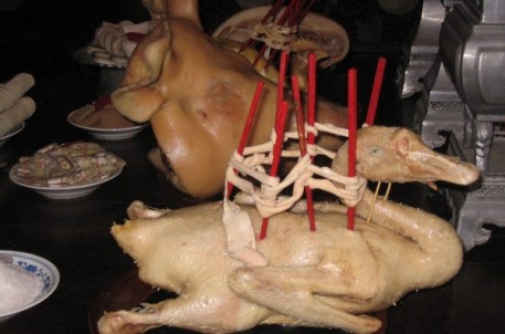 祝福总是在正厅、堂前举行。祭品叫福礼,摆福礼要用八仙桌。祭品多数是要煮熟的,惟有鱼是活的,有的还得经过精心处理。一般的人家用“三牲”福礼,即肉一方、鱼一条、鹅一只。考究一点的则加上鸡和牛肉(或羊肉),这叫“五牲”福礼。最讲究而表示至诚的则还有外加熊掌、羊肉的“七牲”福礼。鸡、鹅要曲着身子,双腿跪着放。在肉和鸡、鹅之类的祭品上,要横七竖八地插上一些红筷子,数目要成单,以七、九为宜。插上十根那是万万使不得的,据说是因为物满则仄,福神以为你家已称心如意了,那就不会再赐福给你,而且弄不好还会降灾惹祸。祭品中的鱼是鲜活的,整条地放在朱漆桶盘上,在眼睛上贴上一张红纸,讲究点的是用红纸剪出的“福”字。