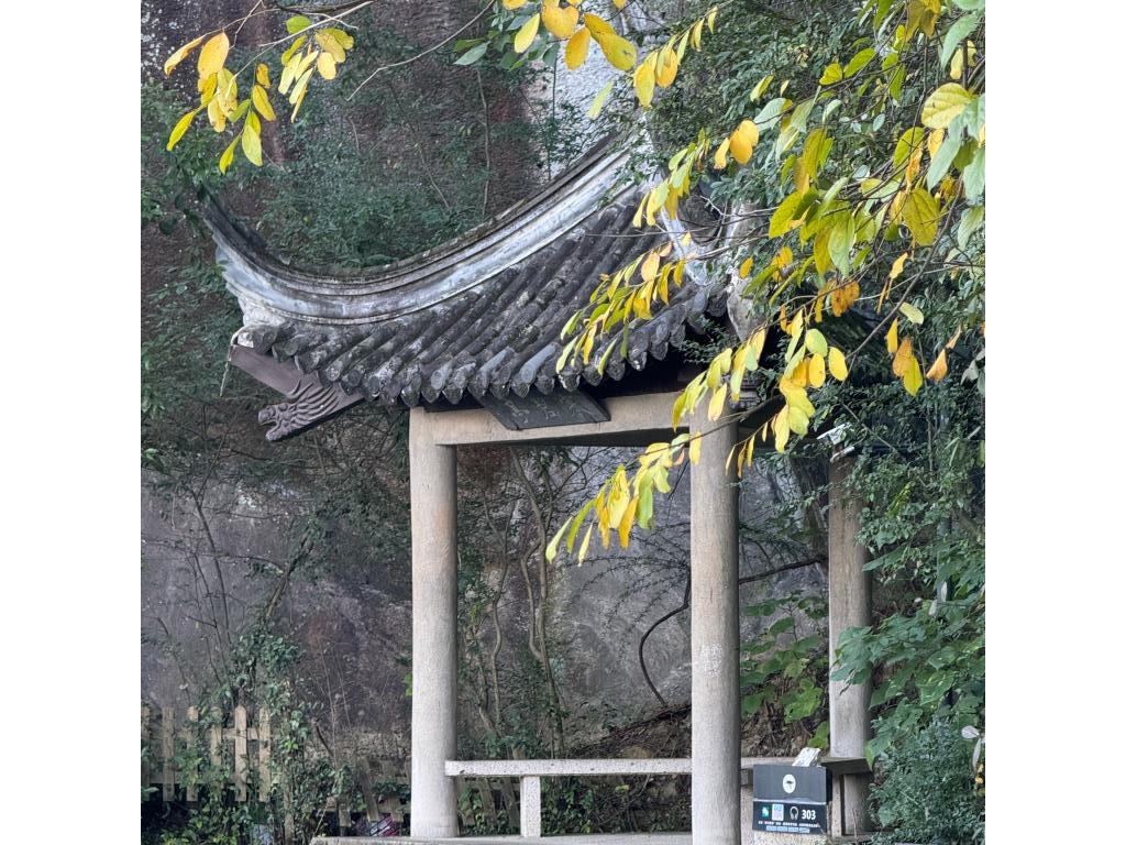 行至陶园最东处,便能看见象征春天的“听湫亭”了,此亭建于清末,与社戏台“扬帆舫”隔水相望。游人于春风拂面中驻足亭内,即可听得陶公洞内崖壁上水珠入潭的清脆声音,如龙湫入水,故取名“听湫亭”。