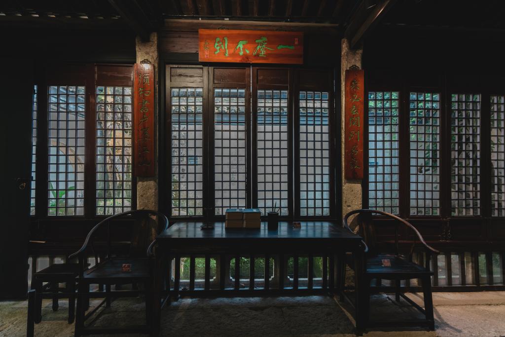 前室中间正上方挂有明代书画家陈洪绶手书的“青藤书屋”匾,下方为徐渭的自画像。画像边有对联“几间东倒西歪屋,一个南腔北调人”,上联讲的是徐渭晚年生活的清苦,下联是对自身的艺术写照。西侧墙上挂有隶书匾对联“牵萝补屋王玉瑛,因树作堂陈老莲”。在朝南窗户上方的“一尘不到”匾,为徐渭手迹。对联“未必玄关别名教,须知书户孕江山”,上联的“玄关”,指居室外门。全联意是:庭院的外门未必能隔绝名声与教化,要知道小小书屋能包容天下江山。由此可见徐渭高雅的情趣和非凡的抱负。
