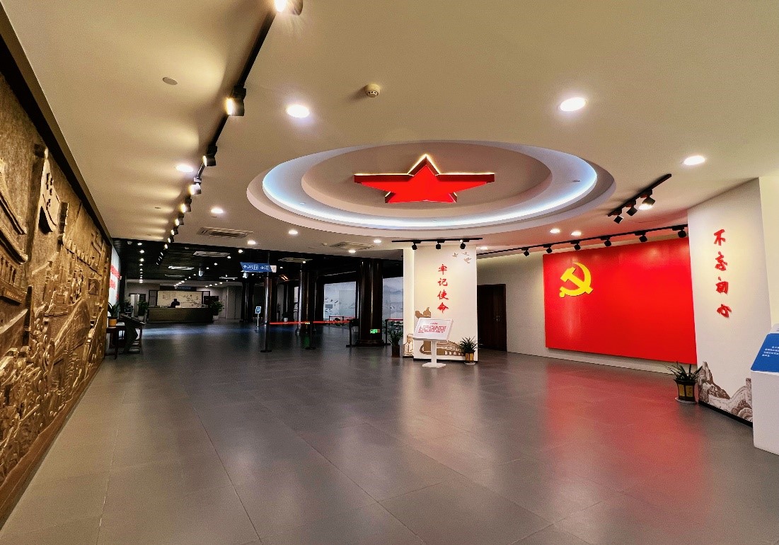 宣誓区以党旗为背景,以五角星为凿井,庄重肃穆。团队可以在此庄严宣誓,重温入党誓词,牢记使命,不忘初心。宣誓厅对面是个浅浮雕墙,是以诗文“航迹”为创作原点,展开联想,讲述党的建设发展历程